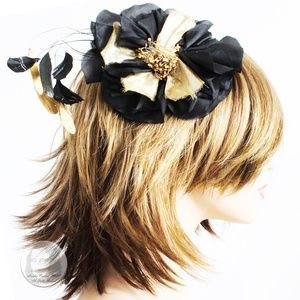 Authentic, preowned, vintage Yves Saint Laurent Rive Gauche decorative hair comb or head piece, likely made in the late 70s. Gorgeous and super-rare head piece comprised of an oversized flower with black and gold petals, and slim green and gold feathers with a hidden hair comb. So stylish and chic, guaranteed to elevate any look! Measures approximately 9in L (end to end). Preowned/vintage with some signs of use and prior wear: some bending to the leaves and flower center from storage (can likely be improved with a professional steaming). Tagged YVES SAINT LAURENT RIVE GAUCHE.