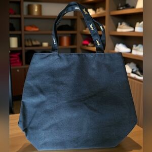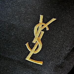 Elegant embroidery in gold and a black canvas YSL tote bag featuring an INCREDIBLE hot pink interior with pocket. Logos are embroidered beautifully.
