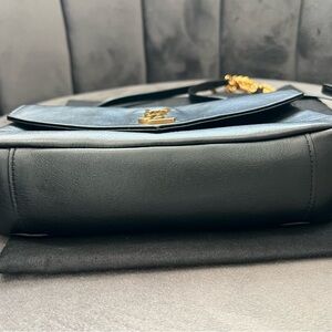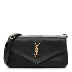 This is an authentic SAINT LAURENT Calfskin Crossbody Bag in Black. This shoulder bag is crafted of calfskin leather in black. The bag features a long leather shoulder strap and polished gold hardware. The front flap snaps opens to a black fabric interior with card slots, a zipper pocket and patch pocket.