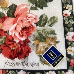 Elevate your collection with this vintage Yves Saint Laurent scarf, showcasing a timeless floral design in shades of blush, crimson, and golden rose on a soft ivory background. The delicate black floral border frames the piece beautifully, highlighting its romantic and classic appeal.