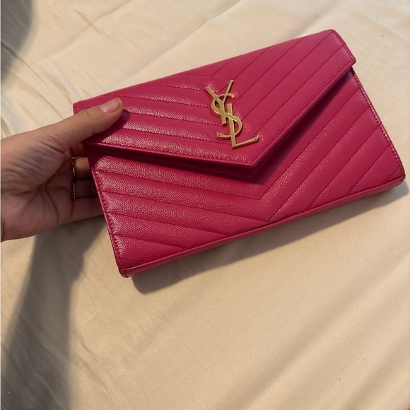 Chic fuchsia clutch with iconic YSL logo. Quilted design adds texture. Ideal for stylish outings.