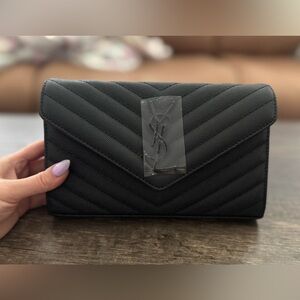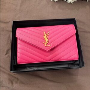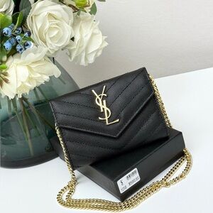 EUC - This is a very rare and vintage bag. I could not find another one like it! It is a gold canvas and leather clutch with handle. It was previously stored flat, which has caused wrinkles in the material. Stuffing and cleaning it did make it better. A steamer could possibly get the rest of the wrinkles out as it is material canvas and not coated canvas. The handle, logo, and rear pocket are leather. Please see all photos as they are part of the listing. The inside is clean. St Laurent Dust bag added to the package. Sharing the love with my posh friends and followers 💜
