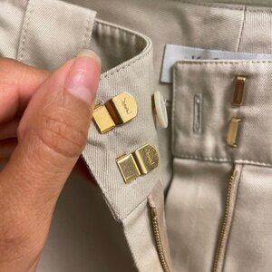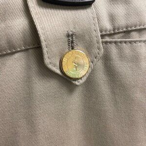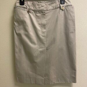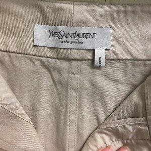 Elevate your wardrobe with this stunning Yves Saint Laurent skirt in khaki cotton twill. This versatile piece features a zip closure, button accents, and pockets for added convenience. Perfect for any occasion, whether it be a party, business meeting, or casual outing, this midi skirt has a straight and pencil style with a preppy theme that is both timeless and chic. Crafted from high-quality cotton twill, this skirt is both comfortable and durable. It comes in a size F38 (US Med 8) and has a mid-rise fit. The solid pattern and beige color make it easy to match with any top, while the fabric type adds texture and dimension to the overall look. Ideal for the fall, winter, and spring seasons, this skirt is a must-have for any fashion-forward woman's wardrobe.