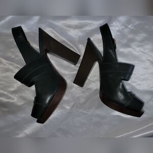 Yves Saint Laurent Leather Peep Toe,Deep Dark Green, Wood Heel, Cert Of Auth,6.5