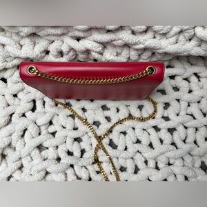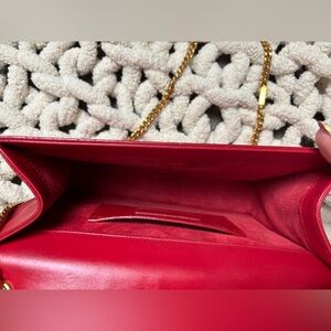This Yves Saint Laurent crossbody bag showcases a vibrant red leather with luxurious gold accents, including the iconic YSL logo and a chic chain strap. Its structured design and elegant tassel charm make it a standout accessory for any occasion.
