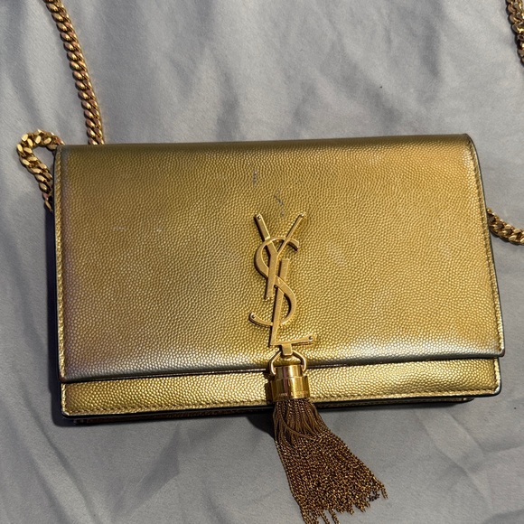 Chic Yves Saint Laurent clutch in metallic gold. Features iconic logo and tassel accent. Includes a stylish chain strap. Shows WEAR & TEAR but possible to get repaired.