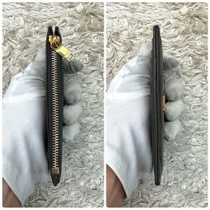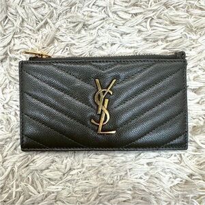 Chic Yves Saint Laurent wallet with chevron pattern. Features metallic gray leather and iconic logo. Ideal for stylish organization.