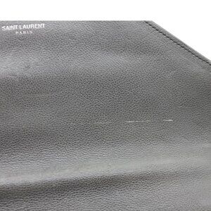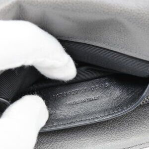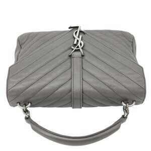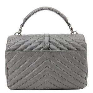 This Yves Saint Laurent Monogram College bag features a matelasse chevron quilted design in grey leather, exuding luxury and sophistication. The chain shoulder strap adds a touch of edginess to this classic style, perfect for everyday elegance.