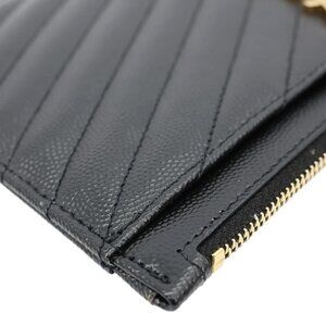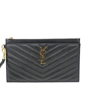 YVES SAINT LAURENT Monogram Grain De Poudre Chevron Leather Zip Pouch Black features textured Grain de Poudre leather with elegant chevron stitching for a refined look. Its slim zip-top design and iconic YSL logo make it perfect for carrying essentials in sleek style.