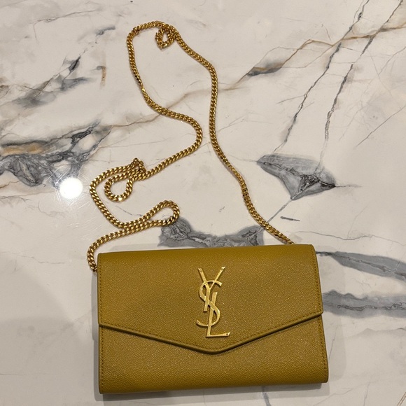 Chic Yves Saint Laurent clutch with a mustard gold finish. Features iconic logo and chain strap. Ideal for elevating your style.