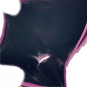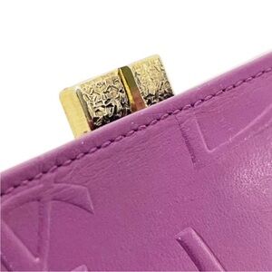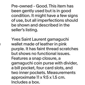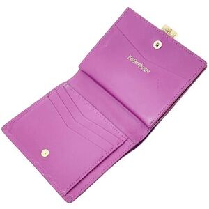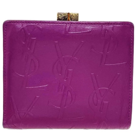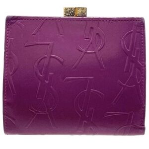 Elegant purple wallet with embossed YSL logo. Gold-tone clasp adds a touch of luxury.