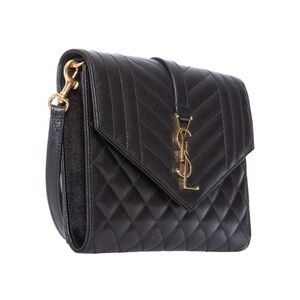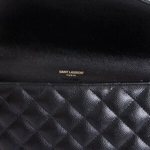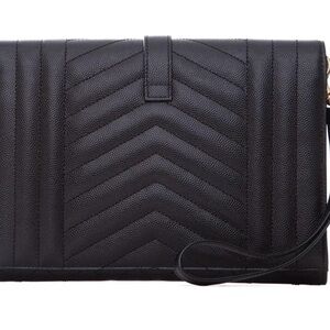 Chic black clutch with quilted design. Features gold YSL emblem. Includes wristlet strap.