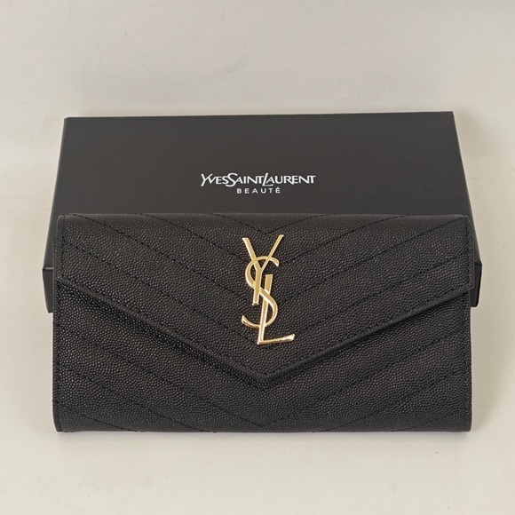 In excellent condition. Elegant black wallet with a striking gold YSL emblem. Perfect for any occasion.