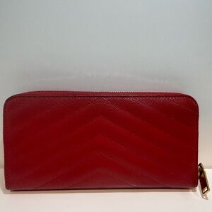 Chic red leather wallet with chevron pattern. Features iconic YSL logo in gold. Stylish and functional.