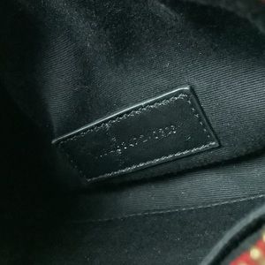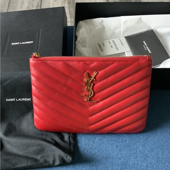 Elegant red clutch with iconic gold YSL logo. Perfect for evening outings.