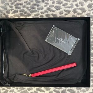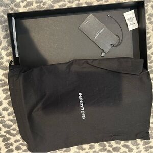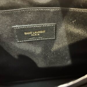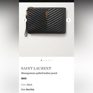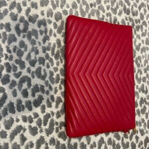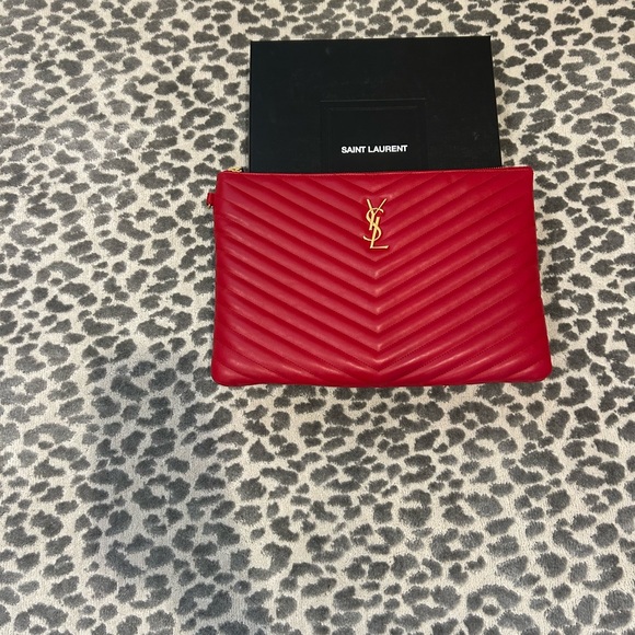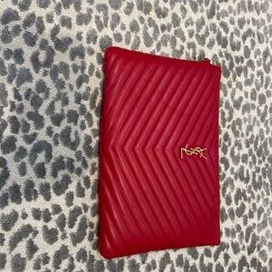 YSL red quilted clutch. Features iconic YSL logo in gold. Perfect for evening outings. Comes with wristlet strap. Excellent condition. Original box and tags included as well as dust bag.
