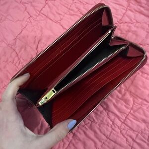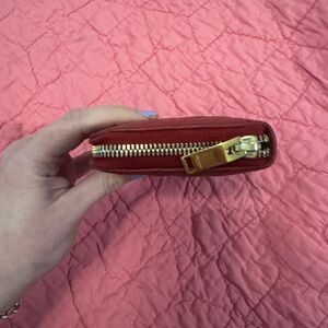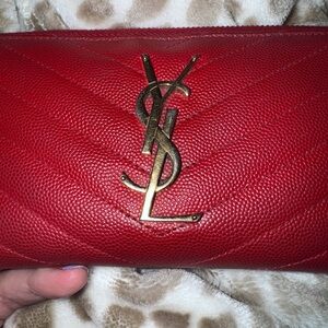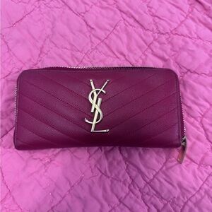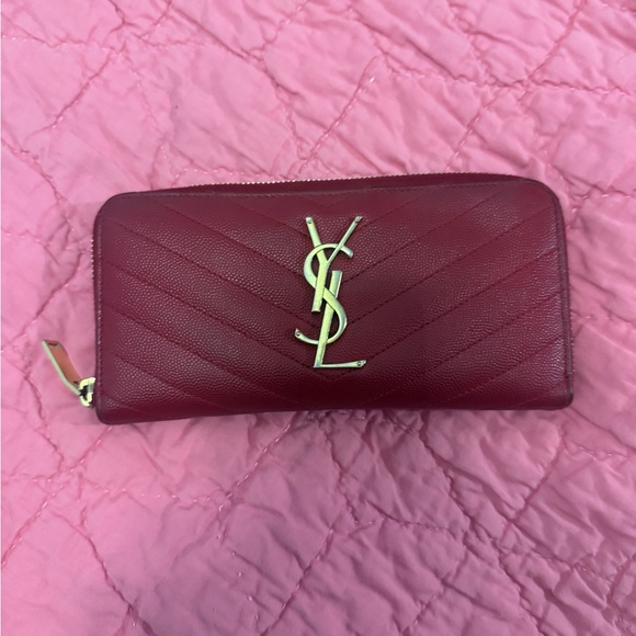 Luxurious YSL wallet with quilted design. Features iconic logo in gold. Stylish and sophisticated.