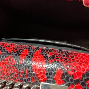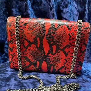 Stylish crossbody bag with a bold red and black snake pattern. Features iconic YSL logo and silver chain strap. Elegant tassel detail.
