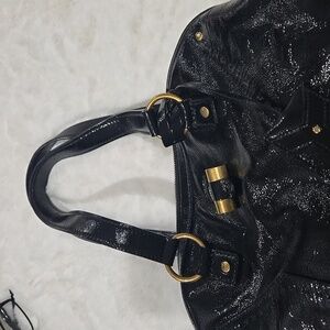 • Color: Black patent leather, gold hardware