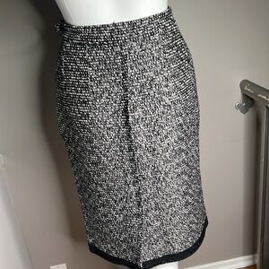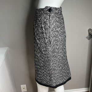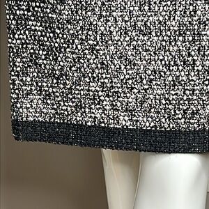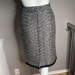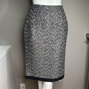 This is a beautiful Yves Saint Laurent Rive Gauche Sz 40 Boucle Black White Silver Thread Pencil Skirt. Inside slip in pockets. One is open the other pocket is still stitched closed. Back slit. Side zipper. Fully lined. No odors. No stains. No tears.