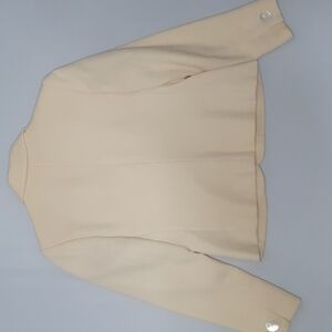 Features: 1 buttton closure, long sleeves, deep vneckline, padded shoulders, 4 pocket styling