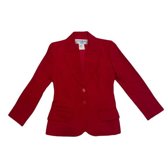 Timeless Yves Saint Laurent Rive Gauche women’s blazer in a bold cherry red wool. Expertly structured with sharp tailoring, notched lapels, dual front pockets, and a two-button front closure. Made in France with luxurious pure wool for a polished, high-fashion finish.