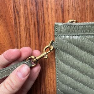 Chic Yves Saint Laurent wristlet in sage leather. Features quilted design and gold-tone logo. Ideal for stylish outings. Only worn a handful of times. Attached receipt from Saks. 100% authentic. In new condition.