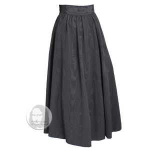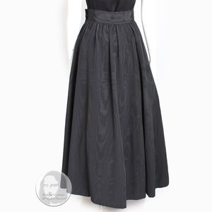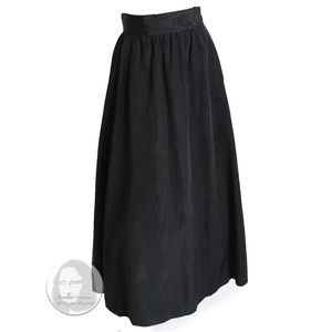Authentic, preowned, vintage Yves Saint Laurent Rive Gauche black moire maxi skirt, likely made for the Ballet Russes aka Russian collection in the late 70s. Made from a taffeta fabric (no content label), it fastens with hook/eye closures and a zip at the wearer's left hip, and features a slash pocket at each hip. Fully-lined, this skirt is voluminous and can be styled so many ways!