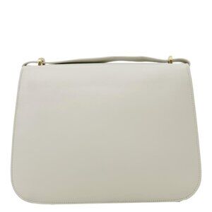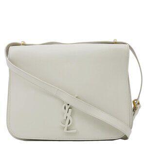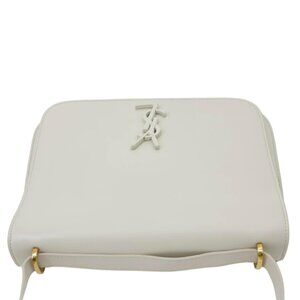 The Yves Saint Laurent Spontini Monogram Satchel Bag in off-white smooth calfskin leather features a classic design with a subtle monogram pattern and sleek gold-tone hardware. The bag has a structured shape and can be carried by the top handles for a sophisticated look.