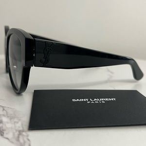 Brand new, and authentic Yves Saint Laurent sunglasses. Cat eye frames with all black YSL logo by temples. Comes with all original packaging. Carrying case, polishing cloth, and authentication card.