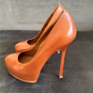 Yves Saint Laurent YSL Tribtoo 105 Cap Pump Nappa Cognac Leather Shoe Heel 38