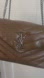 Elegant tan shoulder bag with silver chain. Features iconic YSL logo. Perfect for any occasion.