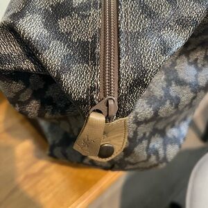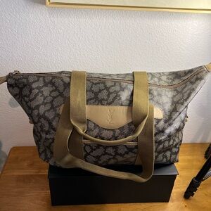 Authentic vintage YSL. Normal signs of usage in good condition and clean interior. This travel bag from Yves Saint Laurent features a stylish tan and gray color scheme, perfect for a chic getaway. The design combines a durable construction with a sleek aesthetic, making it an ideal choice for travel enthusiasts.