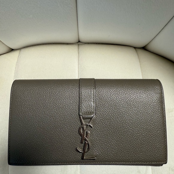 Chic YSL clutch in taupe leather. Features signature logo clasp.