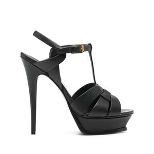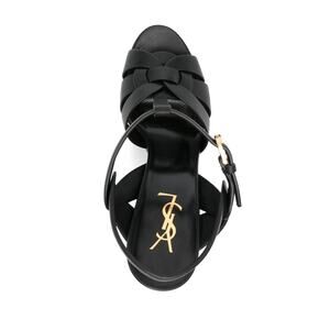Featuring intertwining leather straps, an open toe, and a towering platform heel. Open toe. Adjustable ankle strap with buckle fastening. Branded leather insole. Signature YSL Tribute silhouette with elevated sole and sleek finish. Heel height: 13.5 cm. Platform height: 3.5 cm. Material: Outer: 100% Calf Leather. Lining: 100% Calf Leather. Sole: 100% Leather. Made in Italy. Fits true to size