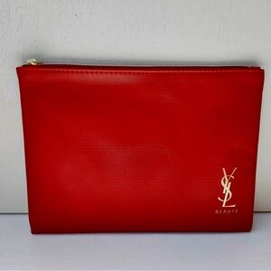 Stylish pink clutch with iconic YSL logo. Features a luxurious gold chain strap. Perfect for elegant outings.