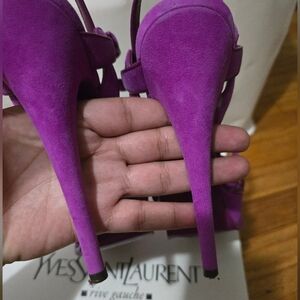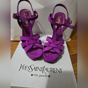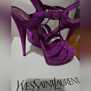 Elegant Yves Saint Laurent heels in a striking purple. Perfect for adding a pop of color to any outfit.