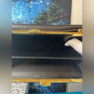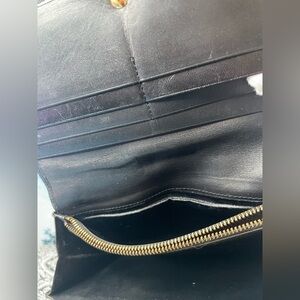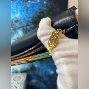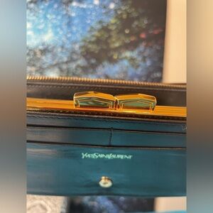 This black leather Yves Saint Laurent vintage wallet features a sleek, structured design with a convenient flap closure, kiss lock coin compartment, making it ideal for professional settings. Its elegant appearance and practical size ensure it can carry essential items with ease. The wallet’s classic color and style make it a versatile addition to any wardrobe. Condition is very good with typical wear found on used leather. There are no holes, rips, tears or stains. Kiss lock is snappy and zipper is zippy. Observe photos carefully for overall condition.