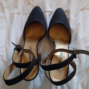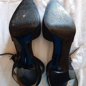 This a black slingback heels. The shoe size is an 8 . The heels are 2.5"s. The shoes have a crossover strap with a buckle. The styles of shoe is an ankle strap. The fabric type is unknown. The shoes are made of leather. They were made in Milan, Italy. The shoes are in excellent condition. I only wore them once. It is a great look and very well made and fit.