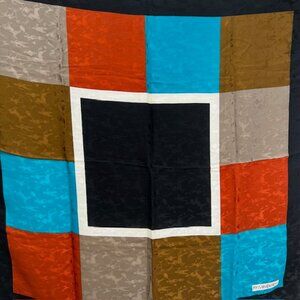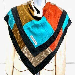 #76. Vintage Yves Saint Laurent YSL 100% Silk Satin Scarf is a luxurious accessory that exudes vintage elegance. With a stylish color block design in black, burgendy , brown, white and blue, this square scarf 34" x 34" is made from high-quality silk fabric and features the iconic YSL logo accents, Made in Italy