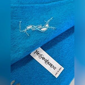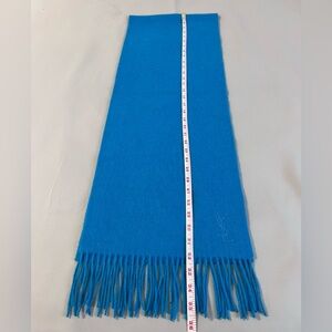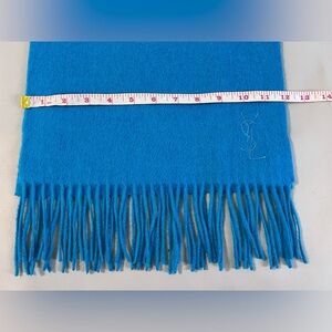 Elevate your style with this gorgeous Yves Saint Laurent scarf, featuring a royal blue hue and the iconic YSL logo. Crafted from high-quality wool and measuring 70 inches in length and 12 inches in width, this scarf is the perfect accessory for any woman looking to add a touch of sophistication to her wardrobe. The fringe accents give the scarf a playful and charming feel, making it a great choice for any occasion.