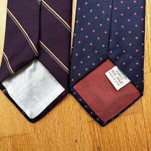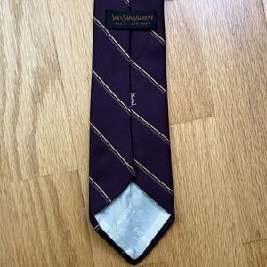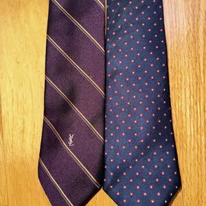 Set of 2 Yves Saint Laurent YSL Men's Silk Tie. One is Navy with Geometric design and it has a tag that says 100% Silk. The other is a Purple Stripe tie and it doesnt say the materials.