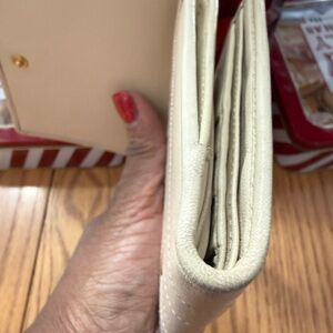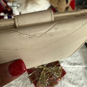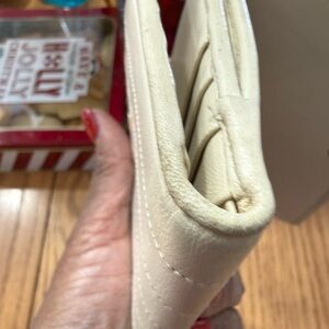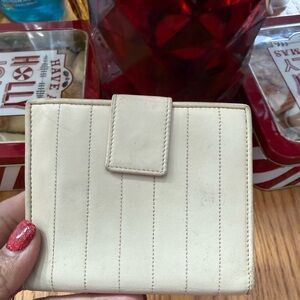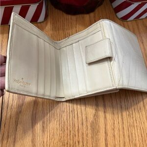 Yves Saint Laurent Paris leather wallet crafted in a soft cream/beige toned leather with vertical stitched detailing and snap-tab closure. A classic, elegant YSL piece with a functional interior and timeless design.