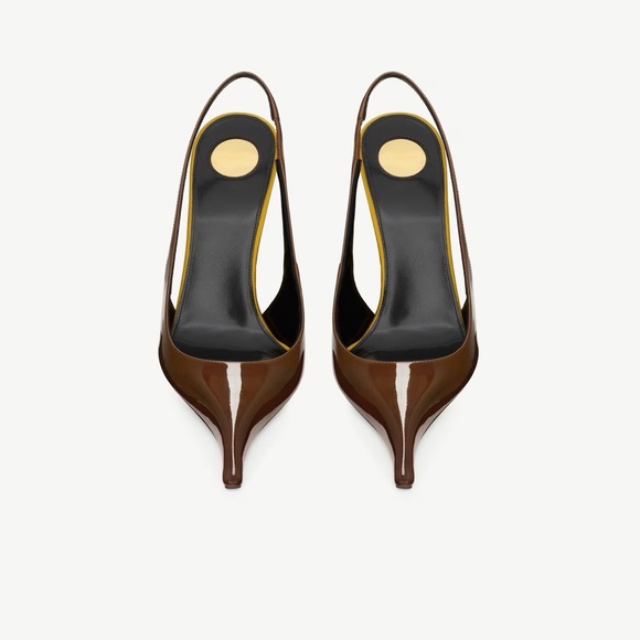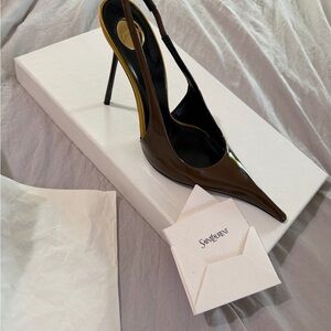 Chic brown slingback heels by Saint Laurent. Sleek design with a modern touch. Worn one time, in excellent condition. Heel height 4.3 inches. Size 38 which is a 7 in US women’s. 100% authentic. See pics for details