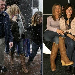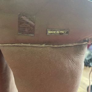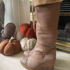 Nut brown suede Yves Saint Laurent Ida round-toe wedge knee-high boots with shearling lining, rubber wedges and lace-up closures at uppers. Shaft: 16" Heels: 4.25" Platforms: 1" I can't find the size on these boots but they are shoe size 39 (US size 9). They measure 10" in length. GUC condition. Boots show signs of wear that include some fading on the suede uppers. The rubber wedges show wear along sides and bottom. Not rips or tears or dents. Please see pics that document wear. As seen on Jennifer Aniston