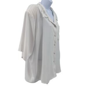 This Yves St. Clair White Blouse, Women's Plus Size 22W, features lace detail and shoulder pads. With short sleeves, it combines classic elegance with a structured fit, making it a stylish choice for various occasions.