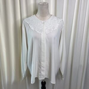 Lightweight long sleeve blouse is white with a large floral embroidery puritan / pilgrim style collar on a crew neckline. Buttons on the cuffs and a hidden button closure down the center. Vintage 1980s.