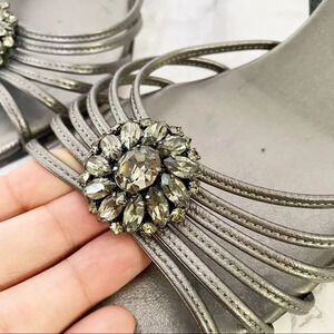 Perfect for a gala or special event, strappy grey silver heels with beautiful crystal embellishment in front.