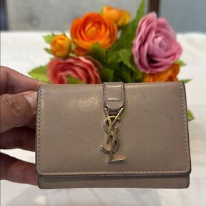 Elegant Yves Saint Laurent card holder in a sophisticated taupe color. Perfect for organizing your essentials with style. in good preloved condition. Does show normal wear and has sone slight flaws, stains etc. please see all photos and ask questions before bidding or purchasing.
