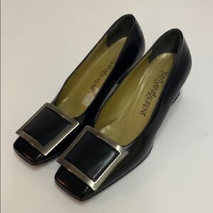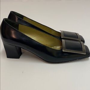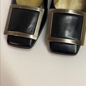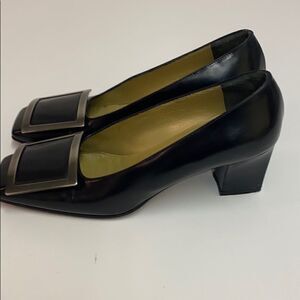 These shoes are in great used condition. They are size 5 1/2 M the buckles are a brushed nickel look. The heel is approximately 2 1/4 inches high